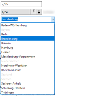 Der Vorschlag kann manuell überschrieben werden. Bundesländer, in denen die Gutachterausschüsse Nachrichten noch nicht elektronisch empfangen können, werden in der Auswahl grau dargestellt:
