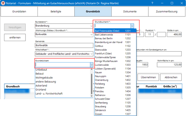 Bei der Erfassung des veräußerten Grundbesitzes können bestimmte Angaben, z.B. beim Grundbuchamt oder bei der Grundstücksart, nur aus bestimmten durch die Justiz vorgegebenen Listen gewählt werden: