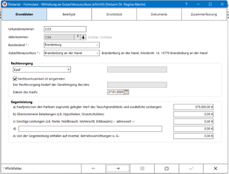 Im Folgenden werden nacheinander die übrigen Karteikarten - ähnlich wie bei der Erstellung einer Veräußerungsanzeige - mit den Daten des Grundstücksgeschäfts befüllt.