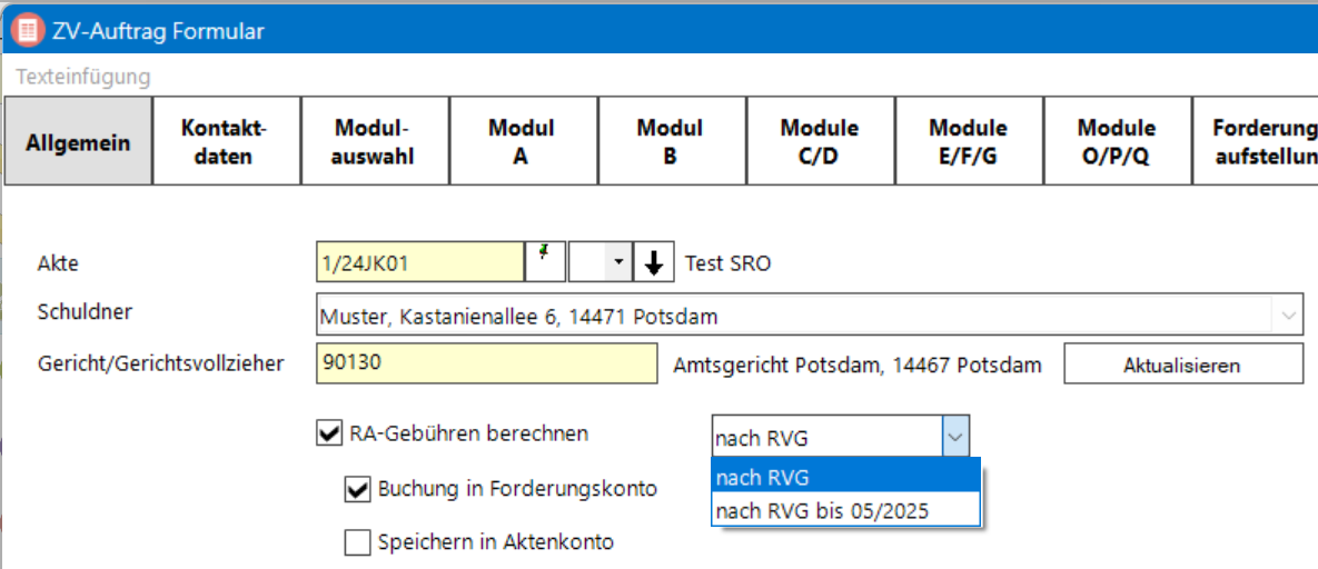 In den Funktionen Foko buchen, den ZV-Maßnahmen und dem Mahnverfahren werden ab dem 01.06.2025 bei der Gebührenberechnung die neuen, mit dem KostBRÄG eingeführten Gebührenwerte berücksichtigt.