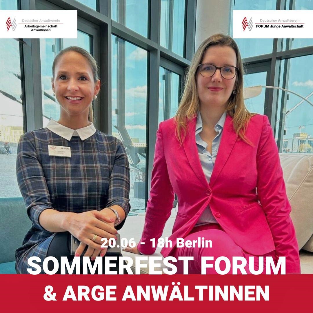 Mit dem nahenden Sommer steigt auch die Vorfreude auf warme Abende und gesellige Zusammenkünfte. Diesen Sommer haben die ARGE Anwältinnen und das Forum Junge Anwaltschaft des Deutschen Anwaltvereins ein besonderes Ereignis für Sie geplant. Am 20. Juni 2024 findet am Großen Wannsee in Berlin ein Sommerfest statt, das sowohl Mitgliedern als auch Nicht-Mitgliedern offensteht und auf Selbstzahlerbasis organisiert wird.