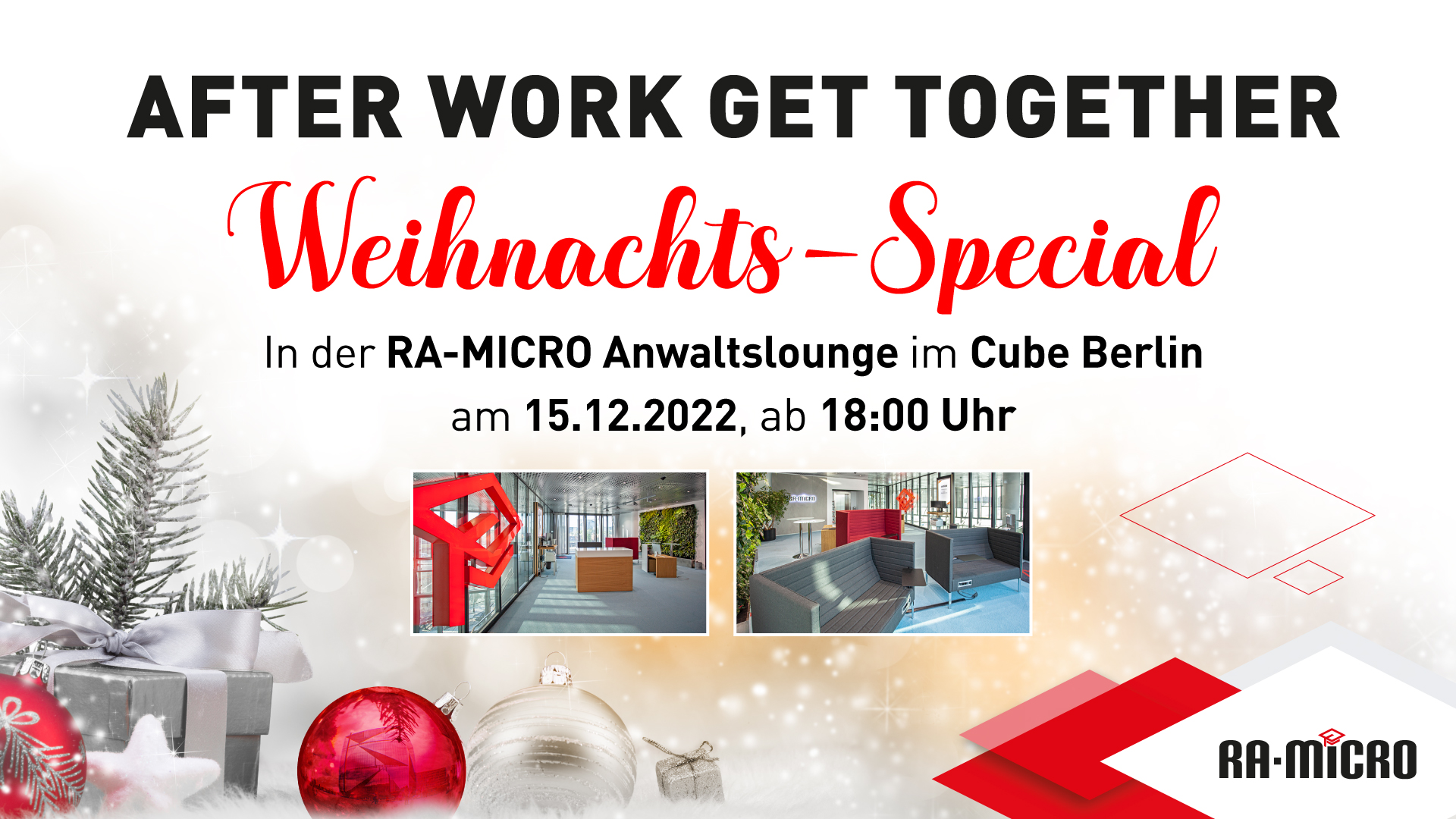 Die zahlreichen und spannenden Netzwerkveranstaltungen in der RA-MICRO Anwaltslounge hat die Berliner Anwaltschaft zusammen mit dem Team der RA-MICRO Landesrepräsentanz Berlin (LRP) zu etwas ganz Besonderem gemacht. Deshalb lädt die LRP die Berliner Anwaltschaft am 15.12.2022, ab 18.00 Uhr, zu einem gemütlichen Jahresausklang bei winterlicher Verköstigung in die Anwaltslounge im Cube Berlin, Washingtonplatz 3, ein. In weihnachtlicher Atmosphäre lassen wir das Jahr Revue passieren und werfen schon einmal gemeinsam einen Ausblick auf 2023.