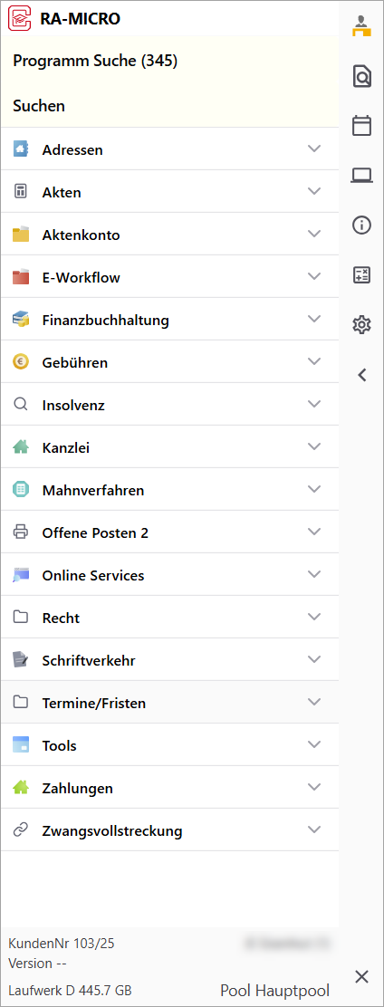 Mit der aktuellen Version steht Ihnen das neue Cockpit-Hauptmenü zur Verfügung. Dieses wird als platzsparende Leiste am linken Bildschirmrand dargestellt und bietet einen zentralen Zugriff auf die wichtigsten Programmbereiche.