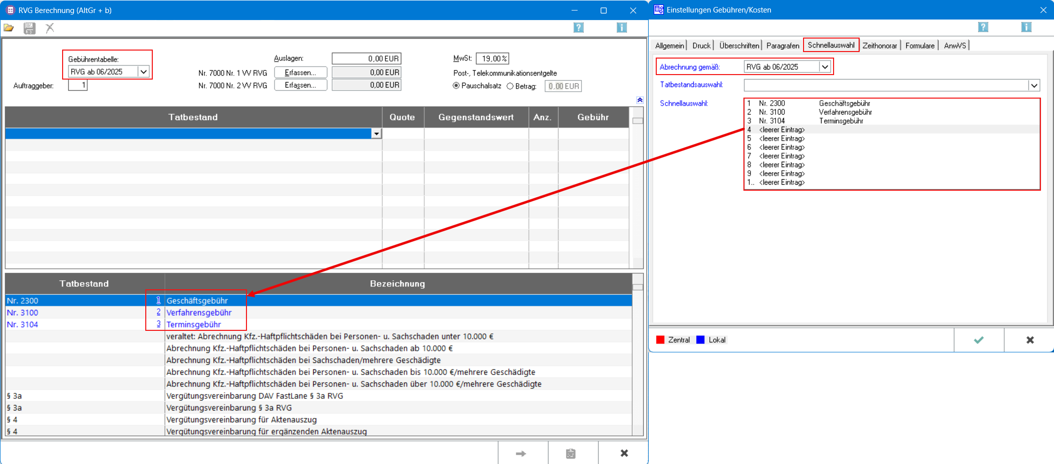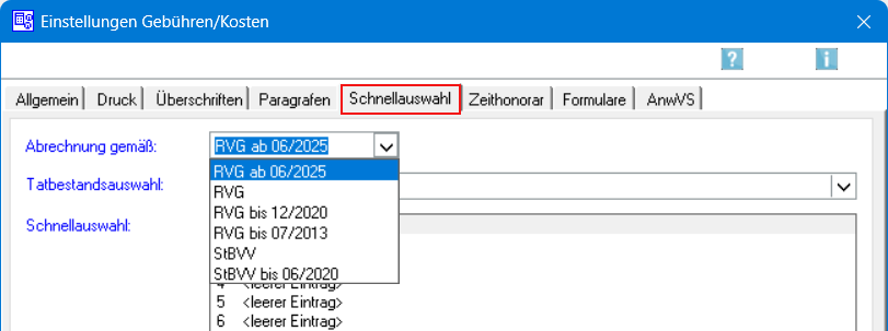 Um die erhöhten Gebührentatbestände zu nutzen, sind diese einmalig über Einstellungen Gebühren / Kosten auf der Karteikarte Schnellauswahl über die Tatbestandsauswahl zur Gebührentabelle RVG ab 06/2025 hinzuzufügen.