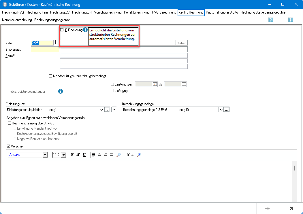 In dem Modul kaufm. Rechnung steht ab jetzt die neue Funktion E-Rechnung zur Verfügung.