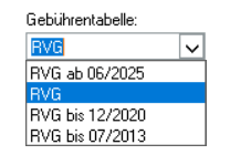 Die anzuwendende Gebührentabelle wird bei Erstellung der Vergütungsberechnung unter Berücksichtigung des Aktenanlagedatums sowie der Leistungszeit automatisch vorgeschlagen und kann über eine Auswahlbox geändert werden.