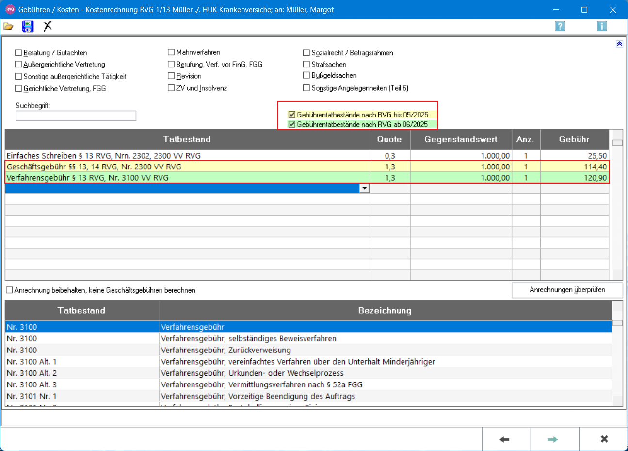 Gebührenabrechnungen nach der aktuellen RVG-Gebührentabelle sowie tabellenübergreifende Abrechnungen über die letzten beiden Gebührenanpassungen sind somit möglich.