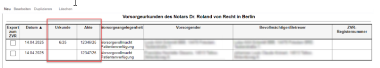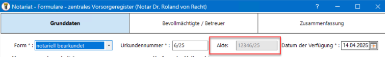 Für die Erstellung einer Meldung zum Zentralen Vorsorgeregister wurde eine Verbindung zwischen Urkunden- und Aktennummer geschaffen.