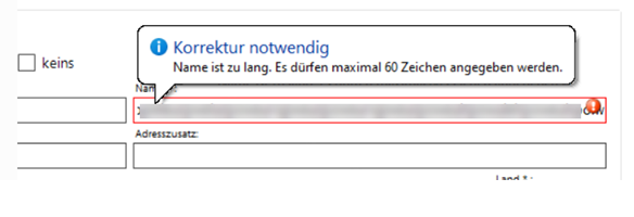 Durch die Schnittstelle sind Maximallängen für die Eingaben in den einzelnen Feldern festgelegt. Sollten die Eingaben diese Maximallänge überschreiten, erfolgt ein Hinweis: