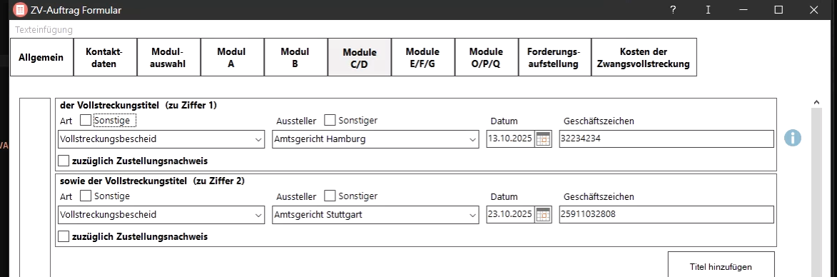 Die Erfassung der Titel über den Titeleditor gewährleistet die XJustiz-konforme Übernahme der Titel sowohl in die ZV-Formulare als auch in die XJustiz-Fachdatensätze für den elektronischen Versand.