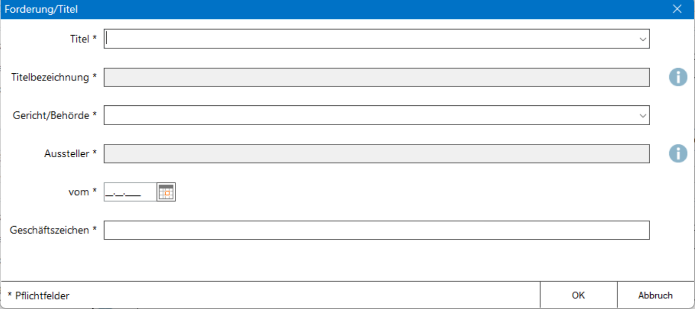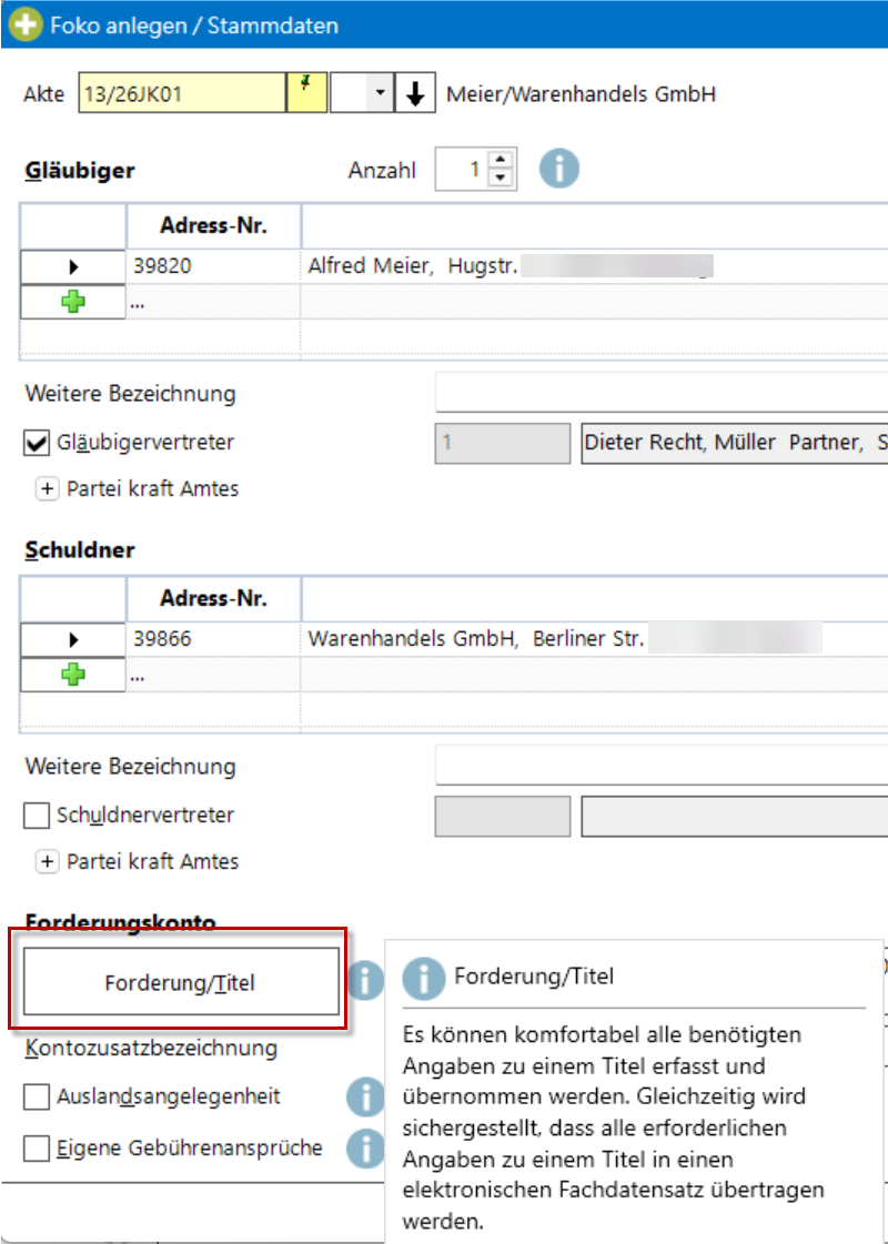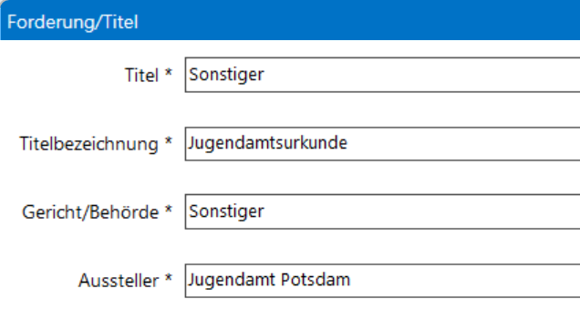 Die vorgenommenen Angaben werden anschließend im Stammdatenfenster im Feld „Forderung/Titel“ angezeigt. Die Eingabe weiterer Titel ist nach erneutem Aufruf des Titeleditors möglich.